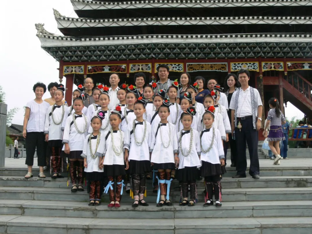 2007年,省联社向榕江三宝侗寨公益捐赠侗族琵琶,时任省联社党委书记、理事长刘乃云与受赠对象合影(杨想妮一排左一)